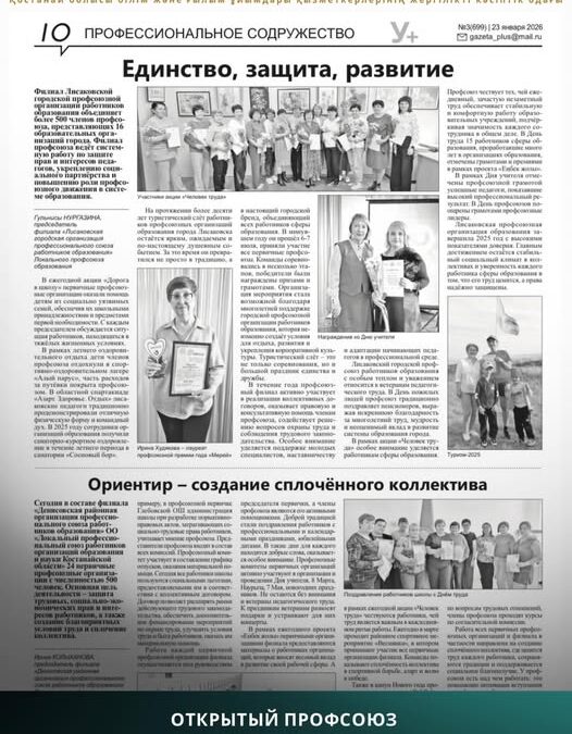 В свежем номере областной общественной информационно-образовательной газеты «Учительская плюс» размещены статьи филиалов Локального профессионального союза работников организаций образования и науки Костанайской области в Денисовском районе и городе Лисаковске.
